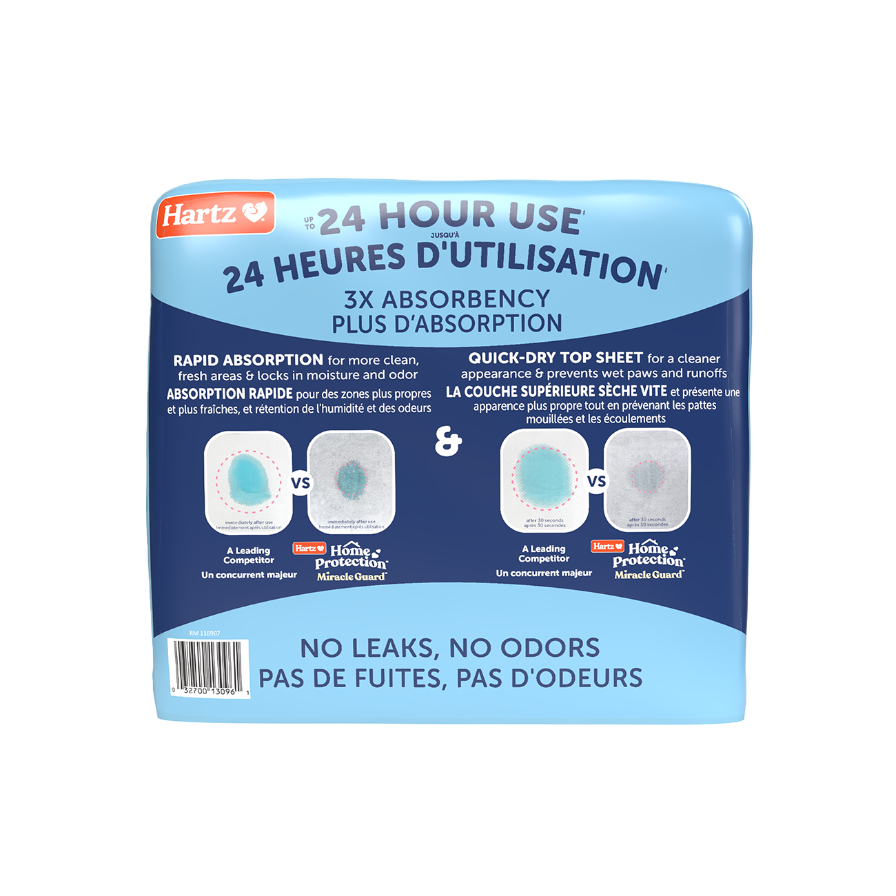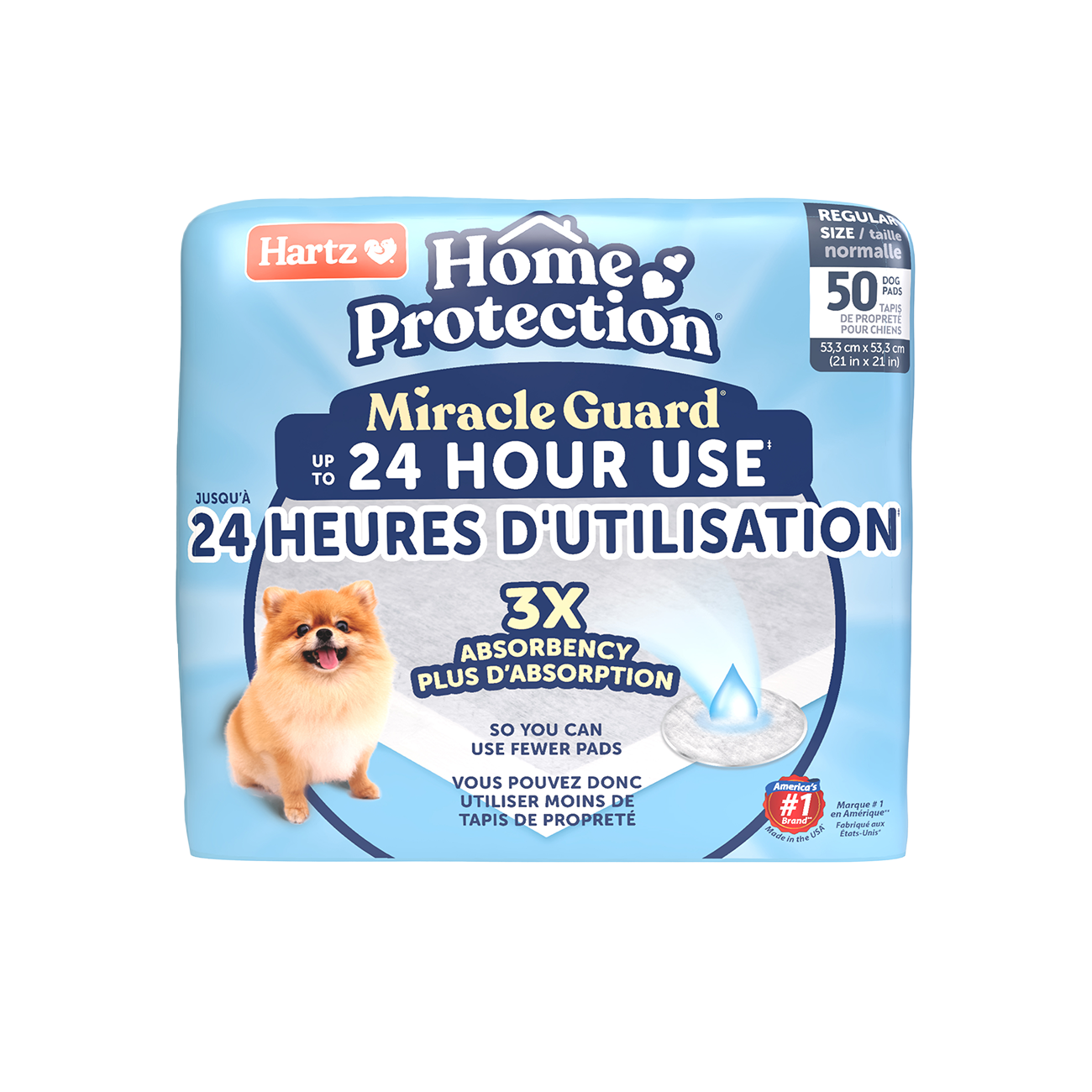 Hartz® Home Protection® Miracle Guard® dog pads are built with 3X more absorbency and feature a spot-concealing, quick-drying top sheet to provide more clean, fresh areas with no leaks or odors. These pads can be left down for up to 24 hours for most medium-sized dogs without compromising a clean home.