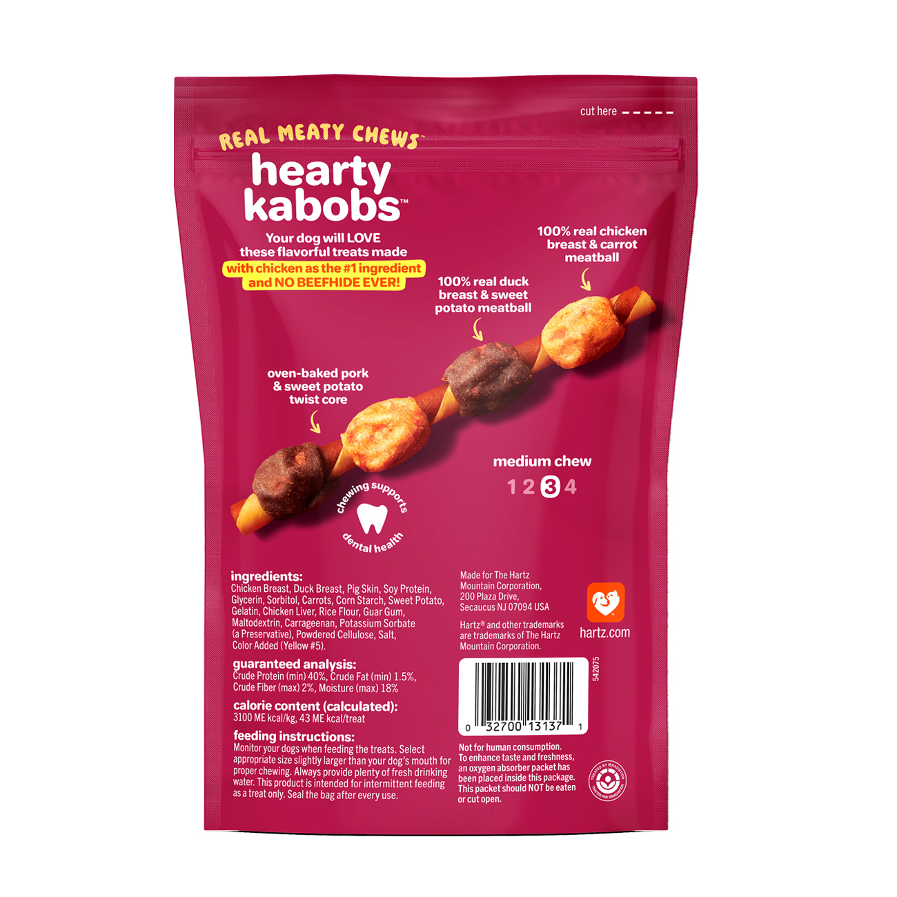Hartz Oinkies Real Meaty Chews Hearty Kabobs are made with 100% real Chicken, Duck, Carrot and Sweet Potato. The savory core is smoked, oven-baked and wrapped with really meaty meatballs and veggies, making this treat irresistible.