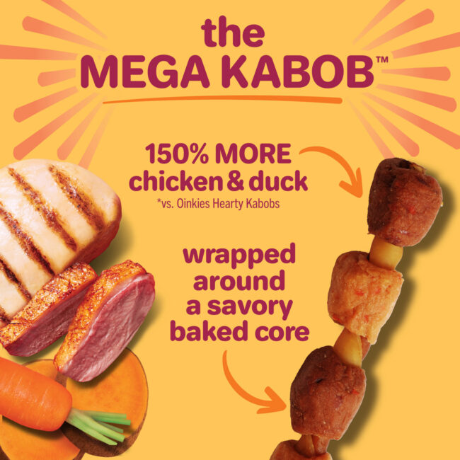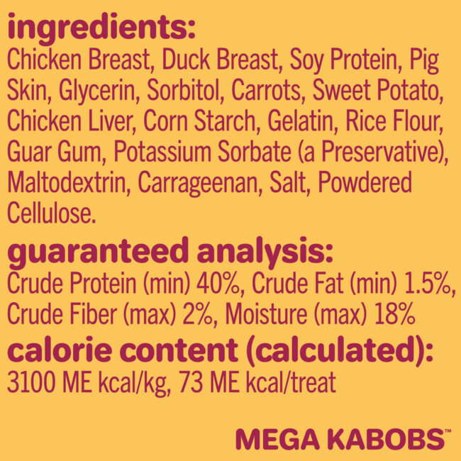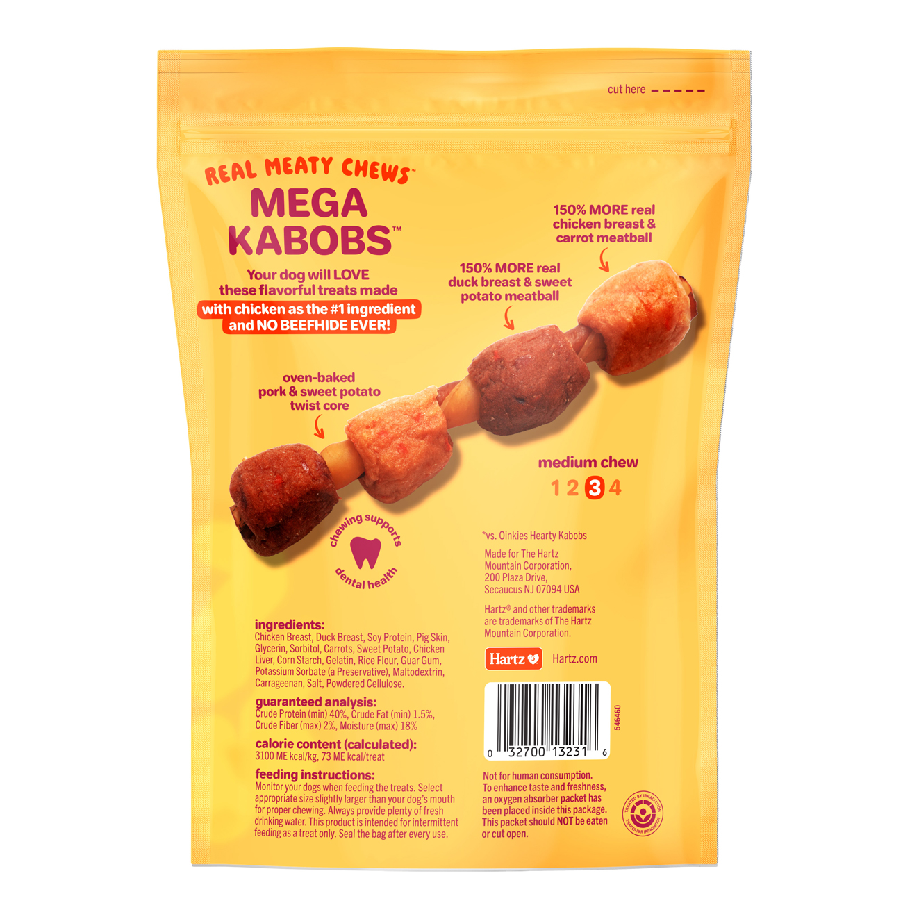 Your dog will LOVE the flavorful Oinkies® Mega Kabobs™ dog treats made with chicken as the #1 ingredient. The savory oven-baked core is wrapped with 150% more real chicken breast, duck, carrot, and sweet potato for irresistible flavor your dog is sure to go crazy for.