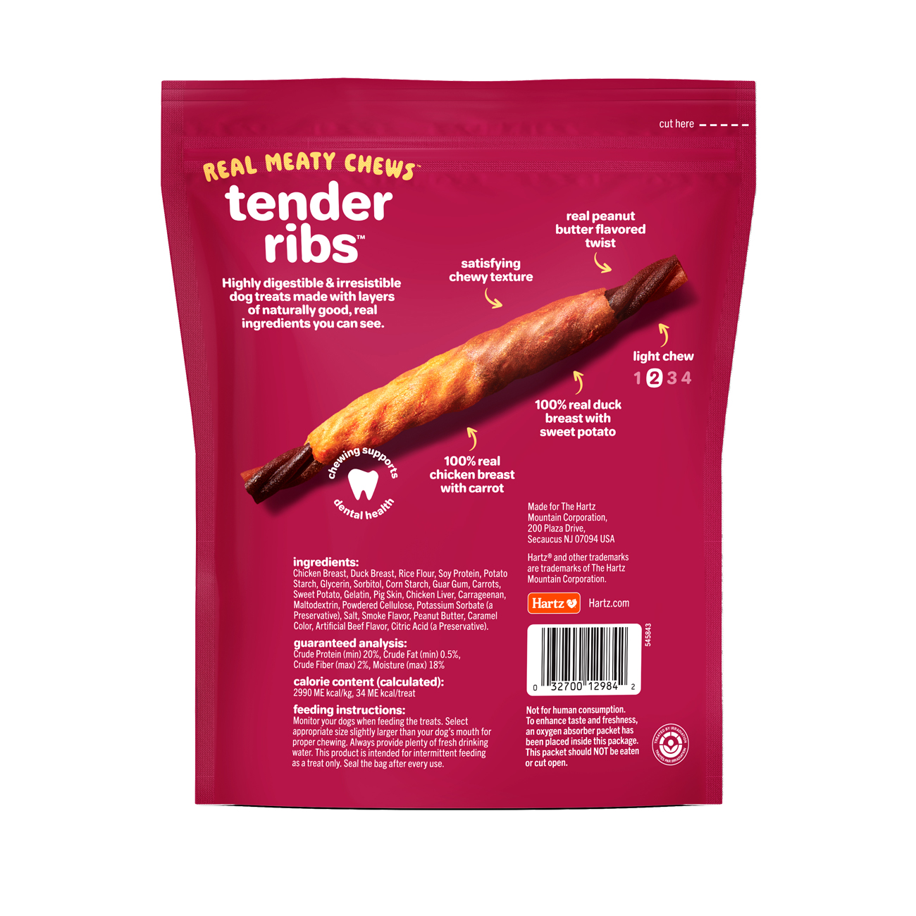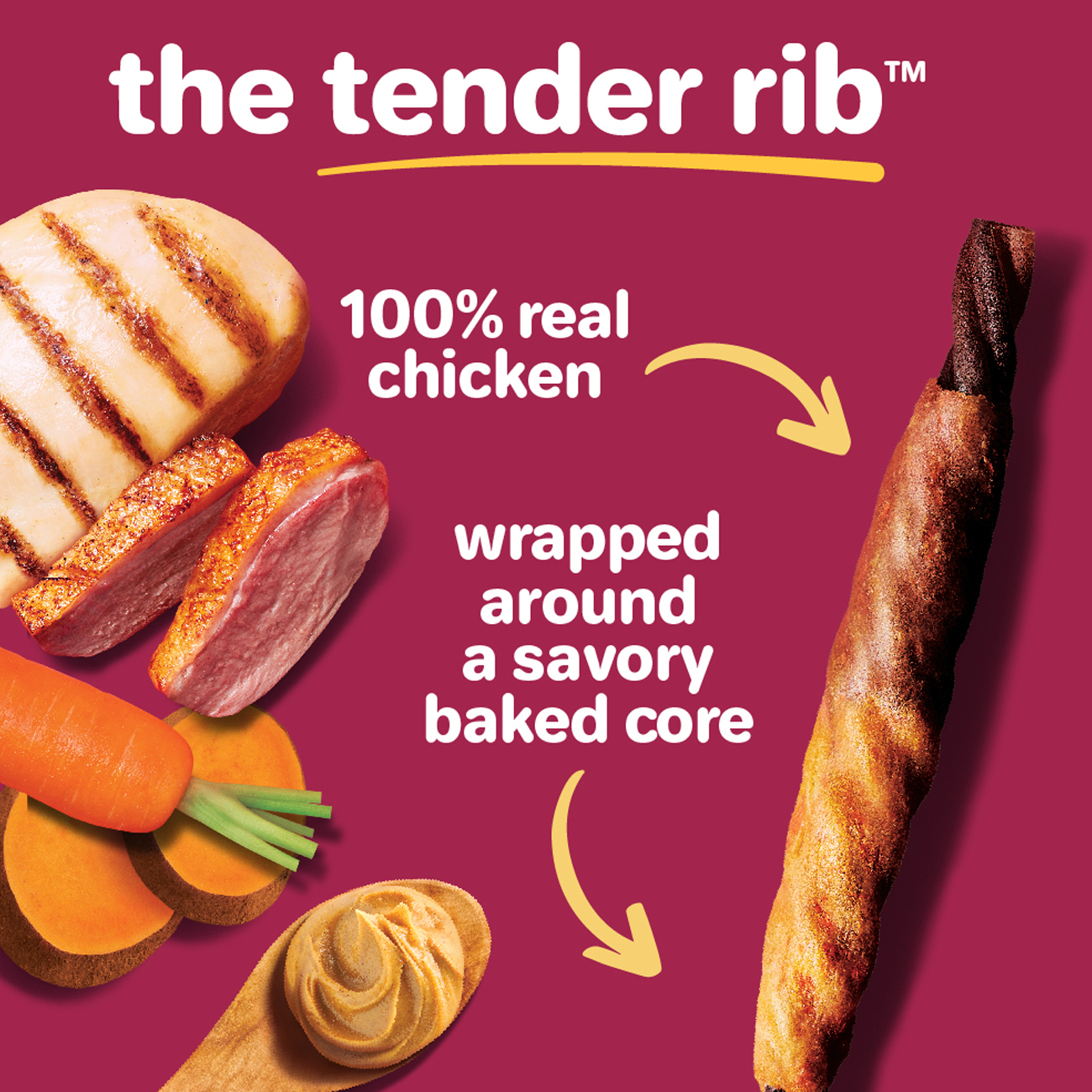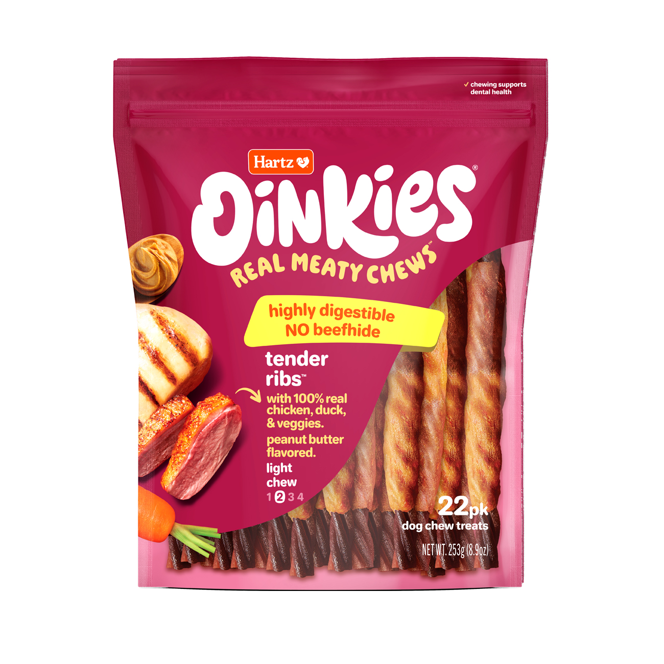 The Hartz Oinkies Real Meaty Chews Tender Ribs is made with 100% real chicken breast, duck and veggies. The peanut-butter-flavored twist core is baked and locks in that irresistible flavor your dog is sure to go crazy for. And since these dog treats are made without any beef hide or rawhide, they’re highly digestible, for easier digestion. The satisfying chewy texture entices chewing to help support good dental health.