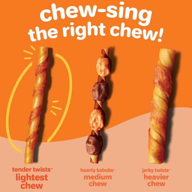 For larger dogs and longer chew times, consider medium and heavy chews with chew meter 3-4.